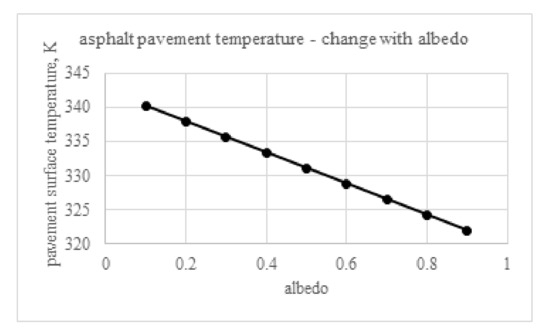 Figure 8 shows asphalt pavement surface temperatures with increasing albedo values. The result show that the surface temperature is approximately reduced by 2.3 K as the albedo increases by a value of 0.1. The pavement surface temperature linearly decreases with increasing albedo.