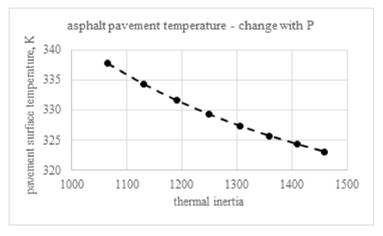 Figure 10 shows the variations in top surface temperature of the asphalt pavement with changes in thermal inertia. The top surface temperature of the asphalt pavement drops by approximately 14 K as the thermal inertia is increased from 1065 J/m2Ks1/2 to 1459 J/m2Ks1/2.