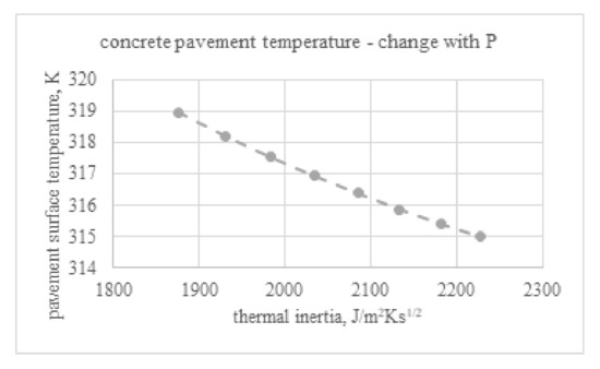 For the concrete pavement, the albedo was kept constant at 0.3, with the same ambient conditions, wind speed, and wind direction. Figure 11 shows the variations in concrete top surface temperature with thermal inertia as the thermal conductivity of concrete is increased from 1.7 W/mK to 2.4 W/mK in intervals of 0.1 W/mK. The concrete pavement surface temperature drops by approximately 4 K only as the thermal inertia increases from 1875 J/m2Ks1/2 to 2229 J/m2Ks1/2.
