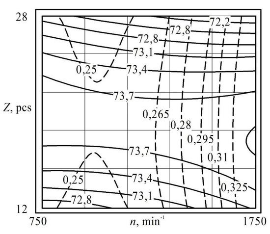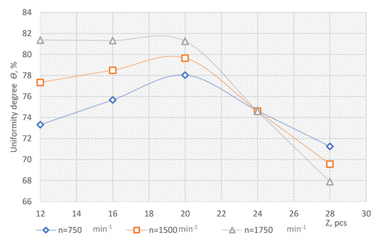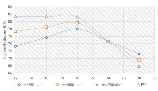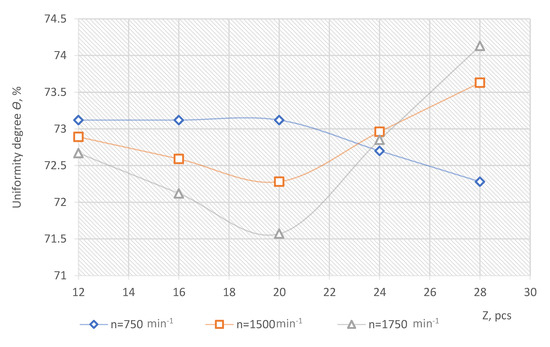 | Impeller Speed n, min−1 | Number of Fixed Blades Z, Pcs | Uniformity Degree Θ, % | Specific Energy Consumption of Electric Energy Eel, kWh/t | |