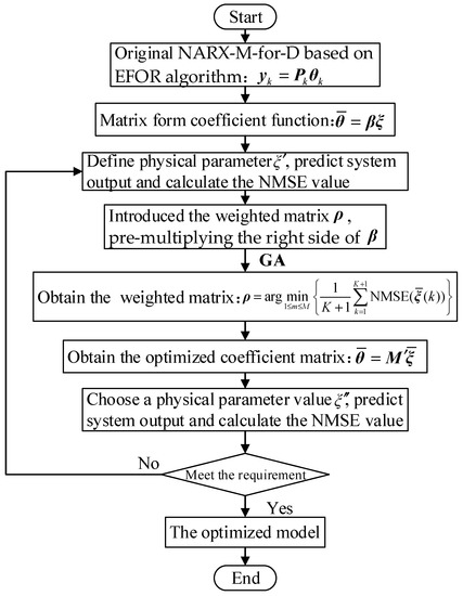 Step 4: Select another design parameter value and then obtain the coefficients of the NARX model by Equation (25). Compare the system output from predicting and simulation, as well as the NMSE calculated by the initial NARX-M-for-D and final NARX-M-for-D to assess the predictive ability of the modified model.