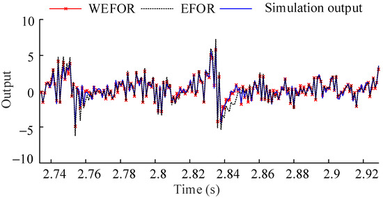 It can be observed from Figure 2 and Figure 5 and Table 2 that the output predictions of the initial NARX-M-for-D will produce significant errors for the other design parameter values due to the complex relationships between the coefficients of the NARX model and design parameter. It can be seen in Equation (23) that the NMSE value is used to quantify the error between the predicted result and the actual result. Therefore, for the identified model, when the value of NMSE is 0, the obtained model is optimal. However, the error between the predicted result of the identified model and the real result cannot be 0, so the smaller the value is, the more reliable the model is. It should be stressed that the final model was obtained by introducing the corresponding data of another parameter for correction. Therefore, the comparison between EFOR and WEFOR was not made on the same basis of adjustable parameters. The comparison here is to show that the optimized model obtained by WEFOR algorithm has better predictive ability compared with the initial model obtained by EFOR algorithm.