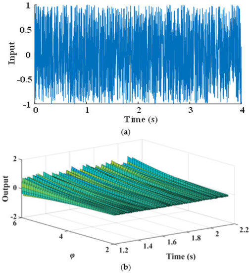 In order to illustrate the process of design by the final NARX-M-for-D, the Gaussian process with zero mean and a variance of is generated as the input signal, as shown in Figure 6a. The predicting outputs corresponding to φ = [2:0.5:6] are obtained by using the MPO method, which is shown in Figure 6b. According to the predicted system output, the corresponding design parameter values can be selected to meet the requirement of design.