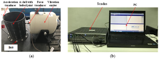 A cylinder with a bolted joint structure, which belongs to the strong nonlinear class [32] is taken as a test subject for the experimental validation. The acceleration transducer is located at the top of the cylinder wall, the force transducer is connected to the vibration exciter and opposite to the acceleration transducer. The experimental test subject and the test system are shown in Figure 7.