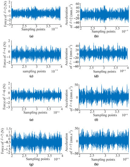 In this case, the Simcenter Testlab system is applied to obtain the input and output signals under different design parameter values of the bolted joint cylinder for verification of the WEFOR algorithm. Denote the input (force) and output (acceleration) variables using u(t) and y(t), respectively. The pre-tightening torque of the bolts is chosen to be the design parameter, which denotes as in this section. Five data sets of 40,000 sample points corresponding to the design parameter δ = [2, 4, 6, 7, 8] Nm were sampled as the input and the output signals. The signals of δ = [2, 4, 6] Nm are used for modeling, and the signals of δ = [7, 8] Nm are used for the modification and validation. The test data sets are shown in Figure 8.