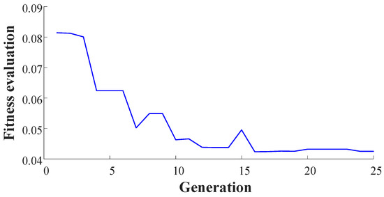 Consider the NARX model expressed in Equation (18) and the results from Figure 2, the output predicted by the initial NARX-M-for-D have significant errors for the design parameter values not used for the modeling. Therefore, the weight matrix is introduced to modify the initial NARX-M-for-D. In order to obtain the matrix, the GA is used to minimize the NMSE of the data sets of φ = [2, 4, 6, 10]. Figure 4 is the fitness function performance trends in the process of the evolution of the NMSE.