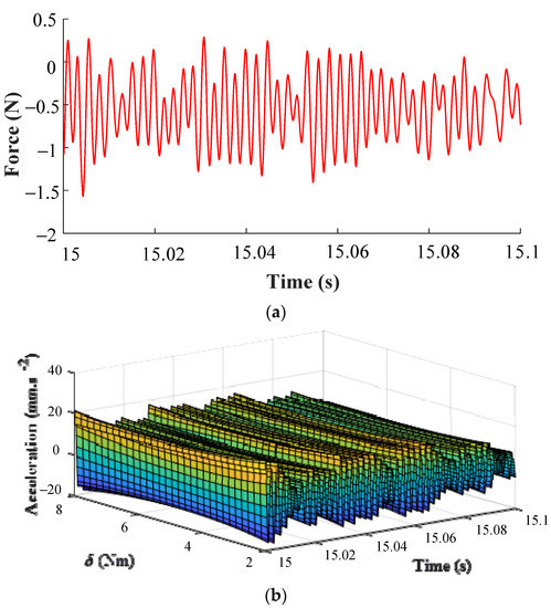 Take the system input signal measured at δ = 2 Nm as the input for prediction, which is shown in Figure 12a. And then obtain the system output corresponding to δ = [2:0.2:8] Nm through the final NARX-M-for-D by using the MPO method, as illustrated in Figure 11b. The corresponding design parameter values can be chosen to complete the process of system design according to the results in Figure 12b. The results also show that the WEFOR algorithm can obtain a more accurate model to predict the output of the complex nonlinear system, and provide a reliable model for the analysis and design.