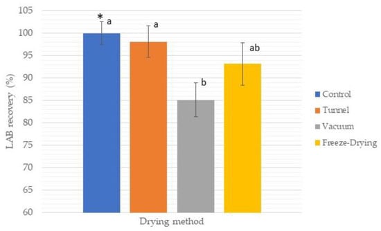 Survival rate (SR) after different methods of drying (tunnel, vacuum, and freeze drying) of F2. Fresh yogurt was used as control. Average of three repetitions. * Bars represents standard deviation. Different letters (a, b) are significantly different.