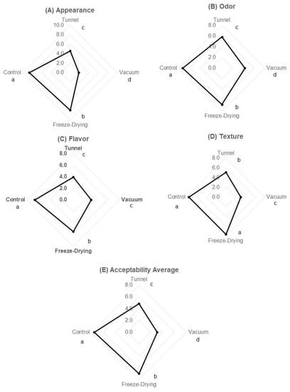 Sensory evaluation of reconstituted yogurt. The figure shows scores of (A) appearances, (B) odor, (C) flavor, (D) texture, and (E) acceptability average. The yogurt obtained by freeze-drying method presented the highest score, while the one obtained by vacuum method showed the lowest. Different letters (a, b, c, d) show significant differences.