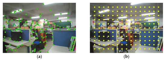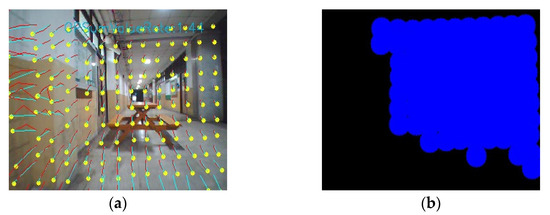 where is current time, and is the recent point redrawing instant of the thread. The tracking process of multiple KLTs running one image frame in serial programming will be very slow, so point tracking is easy to fail. Fortunately, with the multi-core architecture of CPU, we can assign each tracking thread to a core of CPU. Then, as illustrated in Figure 5a, the optical flow in the entire camera field of view can be reliably and continuously detected with real-time performance.