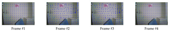 Therefore, the optical flow information that will be utilized for the obstacle avoidance must fill the entire front camera’s field of view. Instead of selecting the corner points, we uniformly draw the points, which are then tracked by the KLT method in the image, as shown in Figure 1b. The points are also drawn on the uniform appearance image region. However, as demonstrated in Figure 2, the points drawn on the uniform appearance region as Figure 2a are easily misled by the similar neighbors after KLT tracking over than ten frames. These wrong tracked points also result in the incorrect optical flow as shown in Figure 2b. Since the life cycle of insignificant point tracking is very short, in order to improve their reliability, the uniformly drawn points must be quickly redrawn after KLT tracking several frames. As demonstrated in Figure 3, most of the points uniformly drawn in Frame #1 are successfully tracked in the following two frames (#2 and #3), even in the uniform appearance image region. In addition, during the MUAV flight, the identified points may disappear due to moving out of the camera’s field of view or being occluded by other objects. As shown in in Frame #1 and #4, considering the fast redrawing frequency can also quickly compensate the optical flow information when the points are missing or tracking is lost.