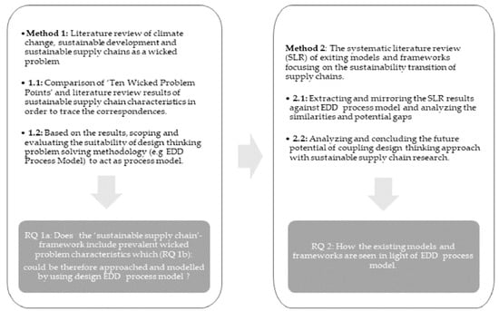 In this article, we first discuss what wicked problems are, and in what way SSCM is a wicked problem. We then describe our process of performing an SLR, the data collected, and our aim to find current models and frameworks on how to handle SSCM as a wicked problem in the context of ST. We wished to mirror the models and frameworks found with the EDD process model and see what kind of novelties this could bring to the field. Thus, we ask how the current methods or frameworks mirror or differ from the EDD process model. The relevant research questions (RQ 1a–2) and the research flowchart are summarised in Figure 1.