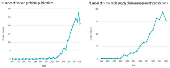 Amount of literature on wicked problems (left) and sustainable supply chain management (right) found via Scopus in September 2021.