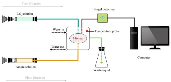In an experimental case, the sample of desired CO2 absorbent was prepared by dissolving pre-weighed amine solvent into deionized water with a certain amount of CA. The pure CO2 gas was bubbled into DI-water for a certain period of time to obtain the saturated aqueous solution of CO2. The of CO2 absorption into the aqueous amine solution with or without CA was obtained by the stopped-flow apparatus. The schematic diagram of the stopped-flow apparatus is shown in Figure 2 and its detailed operational description can be found in our previous work [,].