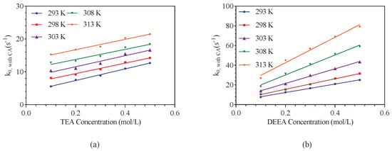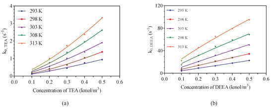 The reaction kinetic data between CO2 and aqueous tertiary amine (TEA and DEEA) solution with temperatures ranging from 293 K to 313 K was listed in Table A1. In the CO2-tertiary amine-H2O system, amine itself is the major contributor to the reaction and the contributions of OH− and water can be negligible [,]. Then, the base-catalyzed hydration mechanism (Equations (1)–(3)) was used to interpret the possible reaction mechanism of CO2 when reacting with aqueous TEA and DEEA solutions. The collected kinetic data shown in Figure 3 (Table A1) was fitted by Equation (5) to verify the possible reaction order of CO2 absorption in amine solution at the temperatures of 293, 298, 303, 308, 313 K, in which the reaction order is approximately equal to one (1.30–1.36 for TEA and 0.83–1.0 for DEEA) with respect to amine concentration over temperature ranging from 293 to 313 K, respectively.