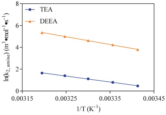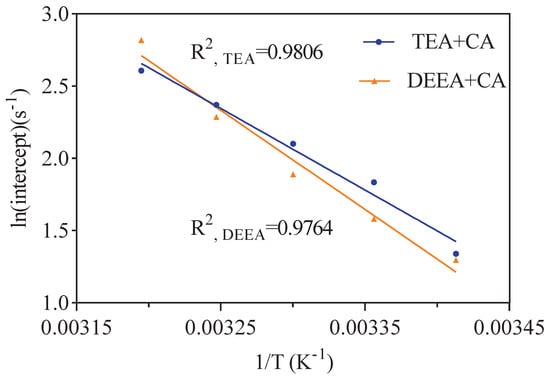 The corresponding Arrhenius equation for with TEA was correlated according to Equation (10) and the results displayed in Figure 4. The calculated activation energy was 45.29 kJ/mol. The Ea values of these amines in the Arrhenius were replaced with calculated values in Equations (11)–(12), respectively.