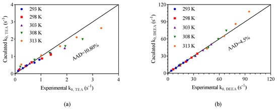 The above obtained values listed in Table A1 were fitted with Equation (10) in order to get values of these amines. All the fitted results of for TEA and DEEA are given in Table A2. It can be easily found that the value is just a function of temperature. It is widely accepted in published studies that can be fitted according to the Arrhenius expression: