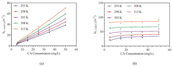 The collection of kinetics data was operated almost the same as Section 3.1, except that a quantitative enzyme is added to the amine solution. The concentration of CA was over a range of 0–50 g/m in 0.2 kmol/m aqueous TEA solutions. The results of collected kinetic data was listed in Table A3 and fitted by Equation (14) shown in Figure 6. Compared with the obtained results of Figure 3, it found that the value was obviously accelerated by the existing of CA in the aqueous amine solution. There is a non-linear relationship between and CA concentration, which is inconsistent with the test results provided by Alper and Deckwer []. The rate constants were well fitted by a linear regression at low amine concentration and reached a maximum value and not changed at higher enzyme concentration. The similar phenomenon was observed in the work of Van Elk et al. [] on the reaction of CO2 with DMMEA catalyzed by a thermostable variant of the human carbonic anhydrase (5X CA) provided by CO2 Solutions Inc. However, the increase of overall reaction rate constants in the DEEA soulution were not significant. This is because the enzyme shows better activity in a near neutral environment and the pKa value of DEEA has a key impact on the catalytic activity of enzyme. Similar conclusions were reached by Wilk et al. [] when using N-methyldiethanolamine (MDEA) and the activator in the form of piperazine.