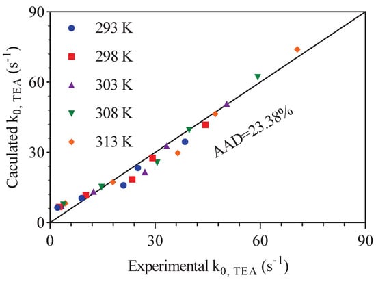 Equations (15) and (16) is the results of the intercept values in Figure 8 fitted in an Arrhenius relationship. In this work, the reaction rate constant is defined as . The reaction kinetics fitting of CO2 reacting with aqueous solution of different amines including TEA were performed. Equation (20) can be obtained combing Equations (4) and (14). The can be replaced by multiplying amine concentration. The values of the calculated shown in Equations (19) and (20) are plotted versus the experimental values in Figure 9. It showed a good performance in predicting values of CO-TEA-HO solution with the AADs of 23.38%.