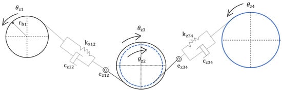 where (i = 12,34) is the moment of inertia for gear; and are the meshing forces for gear 1 and gear 2, gear 3 and gear 4, respectively; and are the relative displacements on the meshing lines of each gear. Specifically