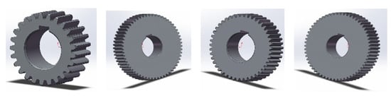 Compared with the experimental device that will be introduced later, the geometric parameters of each gear are listed in Table 1. Moreover, in order to obtain the moment of inertia of each gear, SolidWorks was used to establish the three-dimensional models for all the gears of the two-stage gear transmission system, as shown in Figure 3.