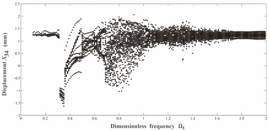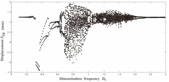 The variable-step Runge–Kutta method was used to solve the corresponding differential equations numerically for the gear transmission system. Primarily, in order to get a comprehensive understanding of the dynamic evolution law of the gear transmission system for both the normal or the fault conditions, their bifurcation diagrams were depicted and compared. Based on the comparison between Figure 5 and Figure 6, it can be seen that the basic structure of the bifurcation diagram for the medium-speed pinion in the fault state with tooth breakage is similar to that for the normal state. Their key difference comes from the numbers of cycles for the system’s periodic motions. Specifically, when compared with the system’s normal state, its fault state with the same system parameters triggers more complicated periodic motions. In addition, when the system enters into chaotic states, the vibration amplitude for the fault state is also greater than that for the normal state.