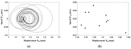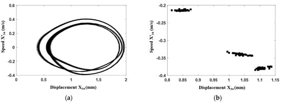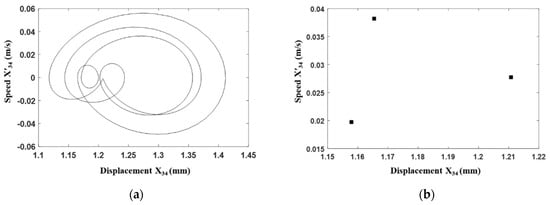 Time domain analysis of the gear transmission system under the fault condition with . (a) Phase portrait. (b) Poincaré map.
