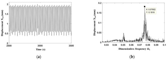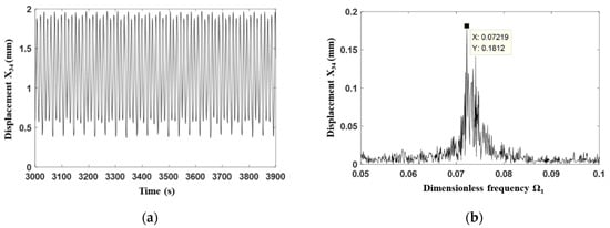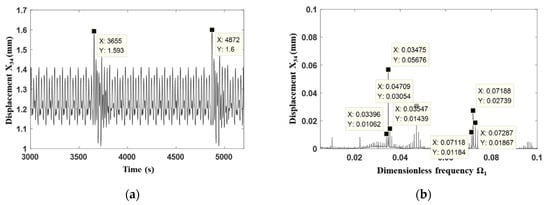 Subsequently, the frequency domain analysis was carried out. The relative displacement between the gear 3 and the gear 4 is shown in Figure 9a for the normal state of the gear transmission system with the dimensionless excitation frequency for the first-stage gear 0.31, thus the corresponding dimensionless excitation frequency for the second-stage gear can be calculated as 0.233, andthe corresponding dimensionless meshing frequency 0.035. Moreover, from the frequency spectrum shown Figure 9b, it can be seen that the main frequency for such a vibration condition is just the meshing frequency . Furthermore, the amplitude of the n/3 (n is an integer) multiple of the main meshing frequency is obviously large, which further demonstrates the three-period characteristics for the corresponding vibration condition.