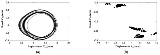 Time domain analysis of the gear transmission system under its normal condition with . (a) Phase portrait. (b) Poincaré map.