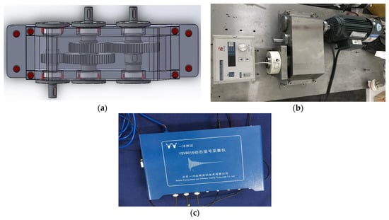 Experimental set up for the gear transmission system. (a) Three-dimensional design. (b) Experimental rig. (c) YSV8016 dynamic signal acquisition instrument.