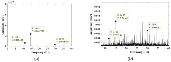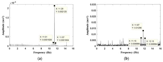 Subsequently, the medium-speed pinion gear was replaced by a gear with tooth breakage as shown in Figure 2, and then the above experimental test was repeated. The simulated and experimental frequency spectrums for the gear transmission system with fault state are shown in Figure 17. The main frequency for numerical result is 11.29 Hz, which roughly matches the main frequency of 11.67 Hz obtained from the experimental frequency spectrum. Numerical simulation shows that the amplitude of the dominant frequency in the fault state (shown in Figure 17a) is higher than that in the normal state (shown in Figure 16a). Furthermore, comparing Figure 17b with Figure 16b, the experimental results also show the same result. Therefore, it can be concluded that the amplitude of the dominant frequency increases when the tooth of gear breaks. In addition, the sidebands with an interval of 0.26 Hz are explored for both the numerical and experimental results, which satisfy the characteristics of the fault with tooth breakage.