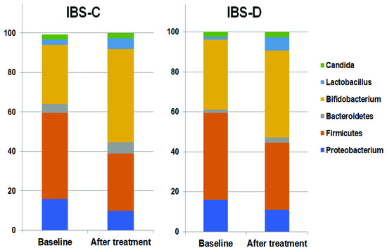 In the fecal microbial analysis, there was an increasing proportion of bacterial genera associated with health benefits (e.g., Bifidobacterium and Lactobacillus), for both IBS-C and IBS-D (IBS-C: 31.1 ± 16.7% vs. 47.7 ± 13.5%, p = 0.01; IBS-D: 35.8 ± 16.2% vs. 44.1 ± 15.1%, p = 0.01). On the other hand, genera of harmful bacteria, including Escherichia, Clostridium, and Klebsiella were proven to decrease after treatment (21.3 ± 16.9% vs. 16.3 ± 9.6%, p =0.02) (Figure 1).
