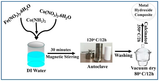 The high purity nitrate salts Fe(NO3)2.6H2O and Co(NO3)2.6H2O were purchased from Sigma Aldrich (St. Louis, MO, USA). The nitrate salts were dissolved in 35 mL of water with 4 gm of urea (CO(NH2)2) and stirred for 30 min. The solution was then transferred to a 45 mL Teflon-lined autoclave and maintained at 120 °C for 17 h, followed by a natural cooling to room temperature [33]. The precipitates were washed with distilled water and acetone several times by centrifugation and then dried for 12 h at 80 °C under vacuum. After this, the derived metal hydroxide composite particles were calcined at 350 °C in the air for 2 h. The schematic of the experimental process is shown in Figure 1 and Table 1 contains the stoichiometry of the salts needed to make FexCo3-xO4.