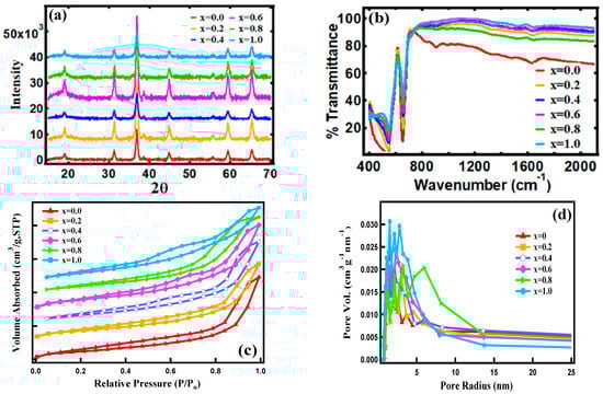 The N2 adsorption/desorption was measured at 77 K with a relative pressure P/Po ranging from 0.029 to 0.99. From these adsorption/desorption curves, BET specific surface areas and corresponding BJH pore sizes were calculated for all FexCo3-xO4 (0 ≤ x ≤ 1.0), as shown in Figure 2c,d. These curves show the most significant number of pores distribution around 2–4 nm for all FexCo3-xO4. This pore size distribution range could help boost the diffusion kinetics inside the electrode material [42]. Table 2 lists measured BJH pore radius, volume, and BET surface area of FexCo3-xO4 samples. The reported higher surface area, in the range of 59.47 to 87.45 m2/g, of samples indicates that the hydrated electrolyte ions could have high contact area at the electrolyte/electrode surface for the Faradaic redox reaction [27]. The observed increase in the surface area of FexCo3-xO4 samples could be due to particle morphology and crystal packing.