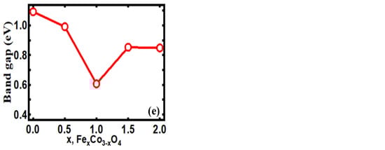 In our DFT computation, we are dealing with a cell with 28 atoms, 12 Co atoms, and 16 oxygen atoms. There are eight octahedra and four tetrahedra sites in Co. So, our first job was to find the most favorable sites for Fe. Calculations show that Fe atoms first prefer to go to octahedral sites. After all of them are occupied, they go to tetrahedra sites. It is also found that the Fe atoms occupying two different sites prefer to have opposite magnetic moments. Those that occupy octahedral sites have negative magnetic moments, and tetrahedral sites have positive magnetic moments. Figure 2d shows that the bandgap varies from 0.60 eV to 1.09 eV for the different values of x from 0.0 to 2.0. For the pure Co3O4 system, a value of 1.09 eV is obtained, which is close to the reported value under the GW approximation [69]. Doping of Fe over Co causes the bandgap to decrease, reaching a minimum, and then increase. The smallest bandgap has a value of 0.60 eV corresponding to the FeCo2O4 compound. The calculation thus shows that FeCo2O4 could be more conductive than other forms of FexCo3-xO4 (0 ≤ x ≤ 2), which is important for practical applications.