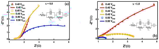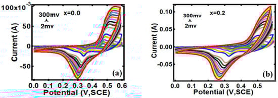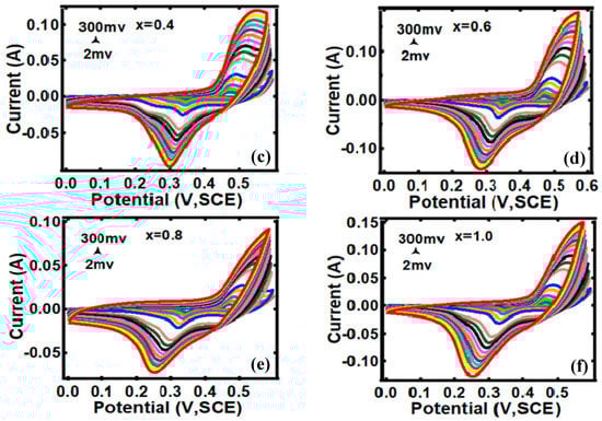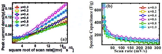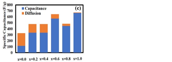 Here, the peak current is I (A), the scan rate is v (mV/s), and a and b are adjustable parameters. The value of b defines the charge storage mechanism and b-values as a function of potential for the cathodic sweeps. The parameter b value is determined by plotting log(i) versus log(v) curves. If b = 1, then the capacitive surface mechanism is dominant, which indicates a fast near-surface controlled reaction, and if b = 0.5, it indicates a diffusion-controlled faradaic reaction during the charge storage mechanism [53]. Figure 5c shows the peak current vs. square root of the scan rate curve. These curves are fitted with Equation (2), which gives values of b~0.5392, 0.4792, 0.3714, 0.455, 0.4336, and 0.4158 for x = 0.0, 0.2, 0.4, 0.6, 0.8, and 1.0, respectively. When the b value approaches 0.5, it indicates that the electrochemical reaction is dominated by ionic diffusion, whereas, when it approaches 1, the capacitive behavior dominates the total process [54]. Furthermore, the lower value of the scan rate region in Figure 5c exhibits a linear relationship with the square root of the scan rate, indicating a quasi-reversible electrochemical process [55]. Figure 5c shows that, at scan rates greater than 100 mV/s, ion diffusion is limited to the surface of the active material of the electrode, i.e., EDLC dominates over the pseudocapacitor, and OH− diffusion can adhere only to the outer layer of the nanostructure, which contributes less to the electrochemical capacitive behavior [56]. On the other hand, at scan rates lower than 100 mV/s, the faradaic redox reaction dominates due to more efficient use of the active material in the working electrode, and diffusion of OH− ions can easily penetrate deep into the nanostructure’s interlayer, resulting in the adsorption of more ions and thus resulting in a higher specific capacitance [56].