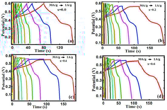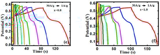 Galvanostatic charge-discharge (GCD) experiments were carried out in 3M KOH solution within the voltage window of 0.0 to 0.6 at varied current densities ranging from 1 A/g to 30 A/g to further quantify the potential applicability of as-prepared electrodes for supercapacitors. Figure 6a–f shows GCD curves. These results indicate that FexCo3-xO4 electrodes can charge and discharge quickly with good electrochemical reversibility at various constant current densities. The non-linear relationship between potential and time in both charge-discharge cycles, as in CV curves, indicates that the capacitance of the studied nanomaterials is not constant between potential ranges and reflects typical PC behavior [58]. The non-linearity of the GCD curve is a consequence of the Co3+/Co4+ ions’ redox reactions with OH−. The discharge process is divided into three distinct steps: the first is a rapid potential drop caused by internal resistance; the second is a slow potential decay at an intermediate time caused by the faradaic redox reaction, and the third is a fast potential decay caused by electric double layer capacitance [30]. The specific capacitance for electrodes of FexCo3-xO4 were calculated using Equation (1).