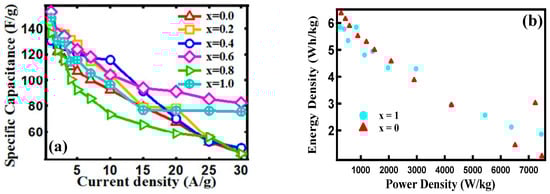 Variation of specific capacitance as a function of current density for the samples (a) and energy density vs. power density for x = 0 and x = 1 (b).