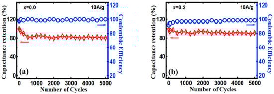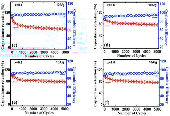 where C# is specific capacitance at various cycles, and C1 is the specific capacitance at the first cycle. Hence, the % retention in specific capacitance after 5000 cycles x = 0.0, 0.2, 0.4, 0.6, 0.8, and 1.0 are 80.4%, 91.3%, 63.4%, 76.7%, 77.4%, and 76.1%, respectively. This shows that, even after 5000 cycles, the electrode shows outstanding cyclic stability, and hence, there is not so much difference in the specific capacitance from their initial values in x = 0.0. Furthermore, the Coulombic efficiency for x = 0.0, 0.2, 0.4, 0.6, 0.8, and 1.0 after 5000 cycles is 100%, 98.5 %, 96.2%, 94.5%, 94.4%, and 93%, respectively. Both % retention and Coulombic efficiency are shown in Figure 8a–f, respectively.