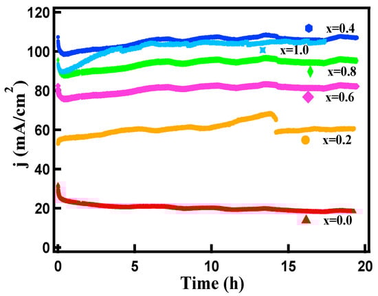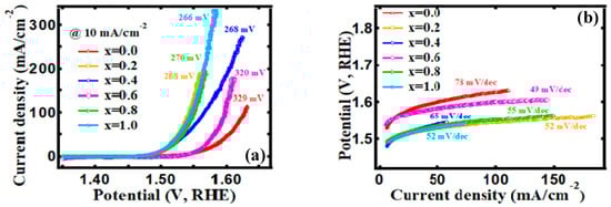 The electrochemical water splitting performance of FexCo3-xO4 samples as an electrocatalyst was explored in a 1 M KOH electrolyte. Firstly, the OER activity of all samples was analyzed using linear sweep voltammetric (LSV) at a scan rate of 2 mV/s in Figure 9a. It was observed that the introduction of Fe3+ induced a change in electrocatalytic behavior by leading to an improvement in electrocatalyst performance. As a result, the onset overpotential of 245 mV and overpotential of 266 mV was achieved for the x = 1.0 sample to deliver the current density of 2 and 10 mA/cm2, respectively. Table 4 shows the onset overpotential (at 2 mA/cm2 current density) and overpotential (at 10 mA/cm2 current density), both of which are indicators of electrocatalytic activity. Tafel slopes are calculated using the following Equation: η = a + b log j, where η is the overpotential, a is the constant, b is the Tafel slope, and j is the current density. Figure 9b shows the value of the Tafel slopes, which are 78, 52, 55, 65, 49, 55, and 52 mV/dec for x = 0.0, 0.2, 0.4, 0.6, 0.8, and 1.0, respectively. The Tafel slope fell dramatically after doping Fe3+ on cobalt oxide, indicating an enhanced OER kinetic reaction, similar to the reduced overpotential.