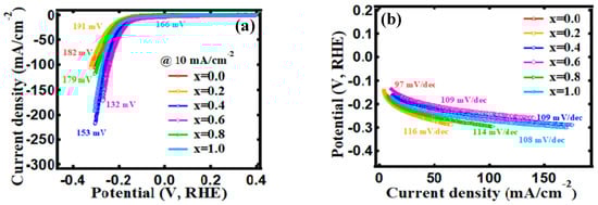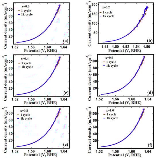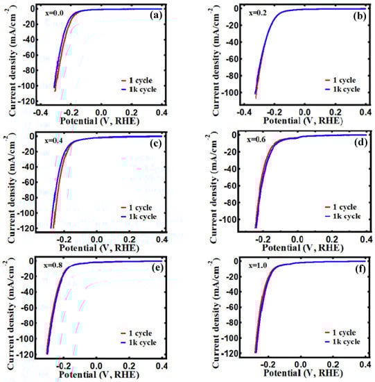 The stability of the electrocatalyst is also a crucial factor for catalyst development, so the first LSV polarization curve was compared with the curve after CV 1000 cycles. Figure 10 showed almost perfect overlaps of the 1stand 1000th cycles, suggesting all electrocatalysts have great stability towards OER. The electrocatalytic HER performance was also investigated using LSV at 2 mV/s in Figure 11a. After being Fe3+ doped (x = 0.6), cobalt oxide with an overpotential of 182 mV showed a greatly reduced overpotential of 136 mV (at the 10 mA/cm2 current density) and a low onset overpotential of 1 mV (at the 2 mA/cm2 current density). A tendency to improve HER performance was observed after Fe’s introduction. The onset overpotential and overpotential are listed in Table 4. Figure 11b shows the Tafel slope for all samples, and the observed Tafel slope was 97, 116, 109, 109, 114, and 108 for x = 0.0, 0.2, 0.4, 0.6, 0.8, and 1.0, respectively. For stability towards HER, the LSV 1st graph and 1000th graph were compared, as seen in Figure 12. There was no discernible difference when comparing the two curves, demonstrating that the electrodes are quite stable for HER. For both the HER and OER processes, the acquired results reveal an adequate and long-lasting response. As a result, the given results make the material appealing for practical industrial electrolysis applications.
