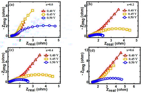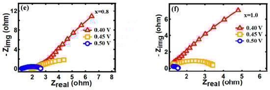 Figure 13 displays the Nyquist plots for all samples. Electrochemical impedance spectroscopy (EIS) measurements were performed at 10 mV AC amplitude in the frequency range of 0.05 Hz to 10 kHz. The electrolyte resistance is represented by the intersection value of the real axis, which is roughly 0.5/cm2 for all samples. This resistance is generally attributed to the wire, electrode material, and electrolyte resistance [70]. In addition, the diameter of the semicircle indicates the resistance at the interface between the FexCo3-xO4 electrodes and the 1 M KOH electrolyte. All graphs showed a decrease in the diameter with increased voltage and decreased resistance in the order of x = 1.0, 0.2, 0.8, 0.4, 0.6, and 0.0. The introduction of Fe3+ increased the conductivity at the interface between the electrode and the electrolyte, which significantly influenced the high activity of the iron-doped cobalt oxide.