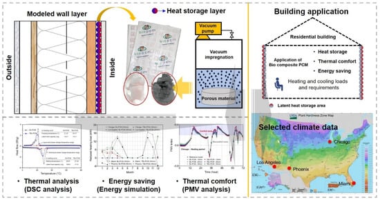 In this study, a wooden house established by the Korea Rural Community Corporation to construct a standard residential house was considered as a building model for energy simulation. The standard wooden house was 6.0 m × 6.9 m × 3.9 m, and this house has a ceiling height of 2.4 m and a total floor area of 41.92 m2. To account for real-world activity, the occupancy, equipment, and lighting schedules were set to run from 18 pm to 8 am on weekdays and all day on weekends. In the simulation, the internal heat gain of the equipment was set to 3.00 W/m2, and the illumination intensity was set to 100 lx. Heating, ventilation and air conditioning (HVAC) conditions were set to simple HVAC to minimize space heating and cooling loads, and heating and cooling setpoints were set to 20 °C and 26 °C, respectively. The simulation period was considered to be one year, and the heating and cooling setback temperatures were set at 18 °C and 28 °C according to the standards of the Ministry of Education. Korea’s Trade, Industry, and Energy (MOTIE) []. In this study, weather data of Chicago, Los Angeles, Miami, and Phoenix in the United States were considered to analyze how energy consumption changes when applied to different climates. Table 1 summarizes the geographical information, average temperature, humidity, wind speed, and Köppen climate classification of four cities (Dfa: hot-summer humid continental climate, Csb: warm-summer Mediterranean climate, Aw: tropical savanna climate with dry-winter characteristics, BWh: arid climate-hot desert). Bc-PCM and TBc-PCM were placed in a sheet of plastic material, which had a thickness of 10, 20 and 30 mm, and was applied between the insulation and the gypsum plaster board. Table 2 shows the construction and material properties of the modeled exterior wall, partition, and roof. Table 3 shows the material properties derived from the DSC, TCi analysis and density measurement of Bc-PCM and TBc-PCM.