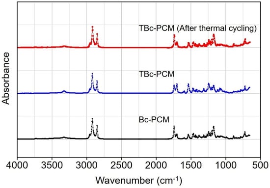 To determine the chemical stability of the Bc-PCM and TBc-PCM, FTIR analysis was performed. Figure 2 shows the FTIR analysis of Bc-PCM and TBc-PCM. In the following graphs, we confirmed that the FTIR absorption spectra of Bc-PCM and TBc-PCM are almost same, with absorption peaks of from 2935 to 2846, 1739, 1701, 1389, 1083, and 717 cm−1, caused by stretching vibration of functional groups of C−O, −CH2, and −CH3. This shows that the FTIR peaks of Bc-PCM have not changed after the impregnation process. This indicates the chemical characteristics of Bc-PCM were not changed. Additionally, the chemical stability analysis of TBc-PCM was carried after repeated thermal cycling (1000 cycles) by FT-IR analysis. As a result, it can be seen that the peak position and intensity according to the properties of TBc-PCM are not change before and after thermal cycling. These results indicate that the chemical properties of TBc-PCM did not change even after thermal cycling, indicating that there is no chemical interaction between Bc-PCM and GNPs.