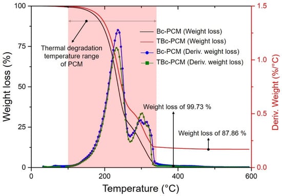 To evaluate the thermal durability of the Bc-PCM and TBc-PCM, TGA analysis was carried out. GNPs were observed to have high thermal durability because thermal degradation did not occur even at 600 °C []. Figure 5 shows the TGA analysis of Bc-PCM and TBc-PCM. In the TGA graph, both Bc-PCM and TBc-PCM have two curves of thermal oxidation degradation. The analysis results indicate that most weight loss occurs in the temperature range of 110–320 °C, where Bc-PCM and TBc-PCM are oxidized. In the graph, the thermal oxidation rate of both Bc-PCM and TBc-PCM represented 99.73% and 87.86%, respectively. They show that TBc-PCM left much more combustion residues, because of incorporating the contents of GNPs in the TBc-PCM. In the thermal conductivity analysis, the thermal conductivities of Bc-PCM and TBc-PCM are 0.150 and 0.568 W/mK, respectively, and the standard errors (SE) were 0.0026 and 0.0011. As a result, TBc-PCM has a 378% increase in thermal conductivity compared to Bc-PCM, indicating that GNPs improved the thermal conductivity of Bc-PCM. Owing to the rapid acceptance of heat energy by the TBc-PCM, it is expected that high thermal efficiency and heat storage properties will be applied to the building field.