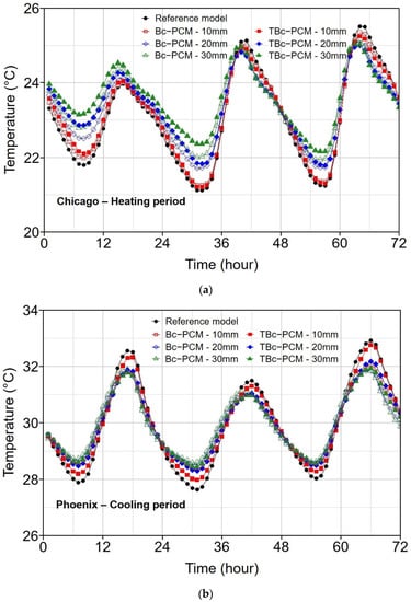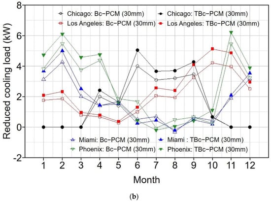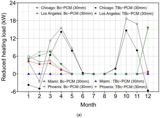 Figure 6 shows the monthly heating and cooling load reduction for the model to which 30 mm of Bc-PCM and TBc-PCM are applied compared to the reference model. Empty points indicate the amount of reduction in heating and cooling load for each city to which Bc-PCM is applied, and filled points indicate the amount of reduction in heating and cooling load to which TBc-PCM is applied. The graph shows that Chicago consumes more heating energy during the heating period when TBc-PCM is applied compared to the reference model. First, because the outside temperature during the heating period of Chicago is lower than the phase change temperature of the PCM, the heat storage performance due to the latent heat of the PCM cannot be expected. Therefore, most of the stored energy is due to the specific heat of the PCM. In addition, when TBc-PCM was applied, the heating energy consumption was larger because the heating heat source was quickly stored in the TBc-PCM owing to its high thermal conductivity. Subsequently, the heating energy stored in the TBc-PCM leads to heat loss through heat exchange with the outdoor air through the wall, leading to an increase in the heating energy consumption. Even in the case of Bc-PCM, the heating energy consumption was higher in February than in the reference model. This is because, when the temperature difference between the outdoor and indoor is large, the heat loss from the wall is large, resulting in more heating energy consumption. In the case of Los Angeles and Phoenix, the heating energy consumption was smaller than that of the reference model. This is because, compared to Chicago, heating energy loss between indoor and outdoor was small due to the small temperature difference. In addition, when Bc-PCM was applied, the heating energy reduction effect was greater than that of TBc-PCM. In conclusion, when latent heat storage does not occur sufficiently, increasing the capacity of the PCM is more effective than applying a PCM with high thermal conductivity. In the case of Miami, the heating energy consumption was low because the outdoor temperature was relatively high during the heating period.