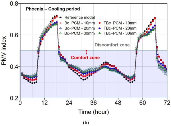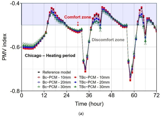 Figure 8a shows the change in the PMV index between 20–22 January and in Chicago. The PMV index was found to be between −0.75 and −0.42. In Figure 8a, the difference in the PMV index between the reference model and the PCM model is not significant because PCM does not store latent heat effectively. Nevertheless, the fluctuation of the PMV change decreased as the thickness of the PCM increased, and the PMV fluctuation decreased when Bc-PCM with a higher amount of PCM was applied than TBc-PCM. In addition, when 10 mm TBc-PCM was applied, the fluctuation of the PMV index change was large compared to the reference model. As mentioned in the surface temperature analysis, heat generated during heating is quickly transferred to TBc-PCM with higher thermal conductivity, but because the amount of PCM that can store heat is insufficient, it causes a rapid increase and decrease in the indoor surface temperature. In other words, the high thermal conductivity and small amount of heat storage caused a sudden change in the surface temperature, which influenced the mean radiant temperature (), resulting in a more rapid PMV change. Evola et al. [] introduced a new parameter for evaluating indoor comfort conditions and the frequency of thermal comfort (FTC). The FTC is defined as the percentage of time that indoor thermal comfort conditions are met within a given period.