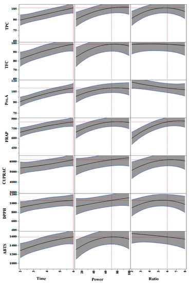 A 2D counter plot of effect of extraction parameters (time: min; power: W; ratio: g/100 mL) on the extraction yield of polyphenols (TPC: mg GAE/g DW, TFC and Pro. A: mg CE/g DW) and antioxidant capacity (FRAP, CUPRAC, ABTS, and DPPH: mM TE/g DW).