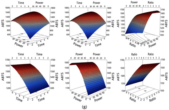 (a) A 3D surface profile of interaction and quadratic effects of extraction parameters (time: min; power: W; ratio: g/100 mL) on TPC (mg GAE/g DW). (b) A 3D surface profile of interaction and quadratic effects of extraction parameters (time: min; power: W; ratio: g/100 mL) on TFC (mg CE/g DW). (c) A 3D surface profile of interaction and quadratic effects of extraction parameters (time: min; power: W; ratio: g/100 mL) on Pro. A (mg CE/g DW). (d) A 3D surface profile of interaction and quadratic effects of extraction parameters (time: min; power: W; ratio: g/100 mL) on FRAP (mM TE/g DW). (e) A 3D surface profile of interaction and quadratic effects of extraction parameters (time: min; power: W; ratio: g/100 mL) on CUPRAC (mM TE/g DW). (f) A 3D surface profile of interaction and quadratic effects of extraction parameters (time: min; power: W; ratio: g/100 mL) on DPPH (mM TE/g DW). (g) A 3D surface profile of interaction and quadratic effects of extraction parameters (time: min; power: W; ratio: g/100 mL) on ABTS (mM TE/g DW).