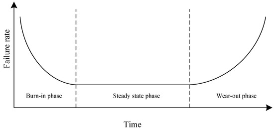 The bathtub curve is divided into burn-in phase, steady state phase, and wear-out phase, which is shown in Figure 1. Due to defects of equipment raw materials and manufacturing, the failure rate in the burn-in phase is usually high. Then the equipment operation after debugging and running-in tends to be normal, while the failure rate decreases. The failure rate of the steady state phase is constant and the lowest. Over time, the failure rate increases with the aggravation of equipment wear and fatigue, and enters the wear-out phase.